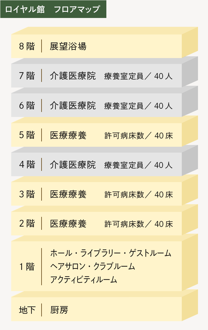ロイヤル館は、介護医療院・医療療養病床がございます。長期の入所生活を楽しんでお過ごしいただくために、お部屋・インテリア・お食事など付加価値をご提供し、展望風呂やライブラリーなどをご用意しております。